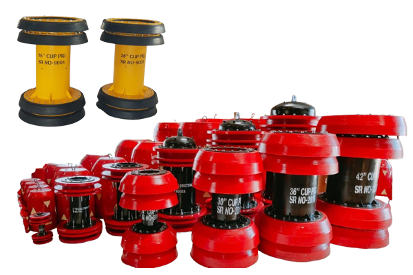 Cup-type batching pigs are used for standard pigging operations such as filling and dewatering during hydrostatic testing, routine batching operations, and product removal. They are available in sizes from 2″ through 48″ with standard designs of 2-cup, 3-cup and 4-cup. When equipped with a gauging plate, they are used to prove pipe roundness and to ensure excessive weld penetration or debris does not exist. Batching pigs are also used to prove minimum bend radius prior to intelligent pig use.